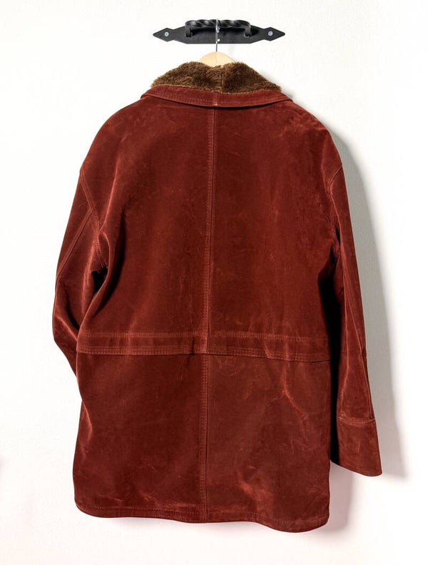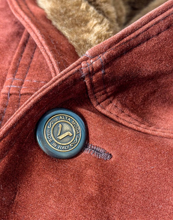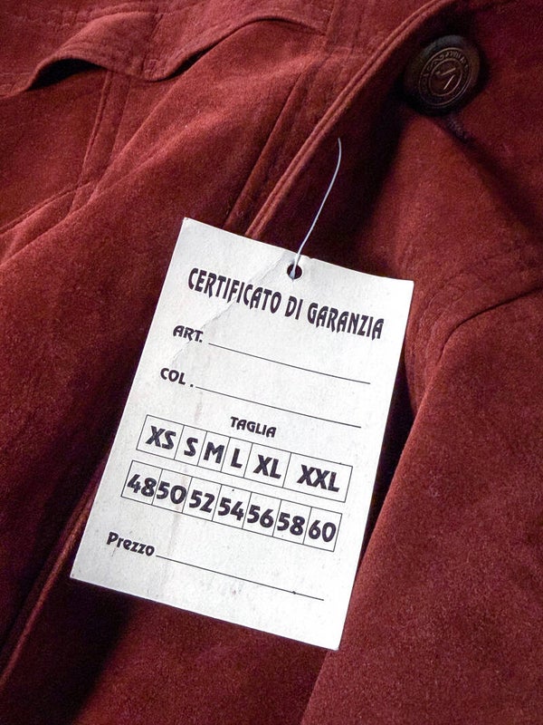 Oryginalna włoska kurtka marki Spiezia, wykonana z niesamowicie miękkiego zamszu w głębokim odcieniu rdzawej czerwieni/kasztanu. Przedmiot typu Deadstock; nigdy nienoszony, z zachowanymi oryginalnymi metkami.