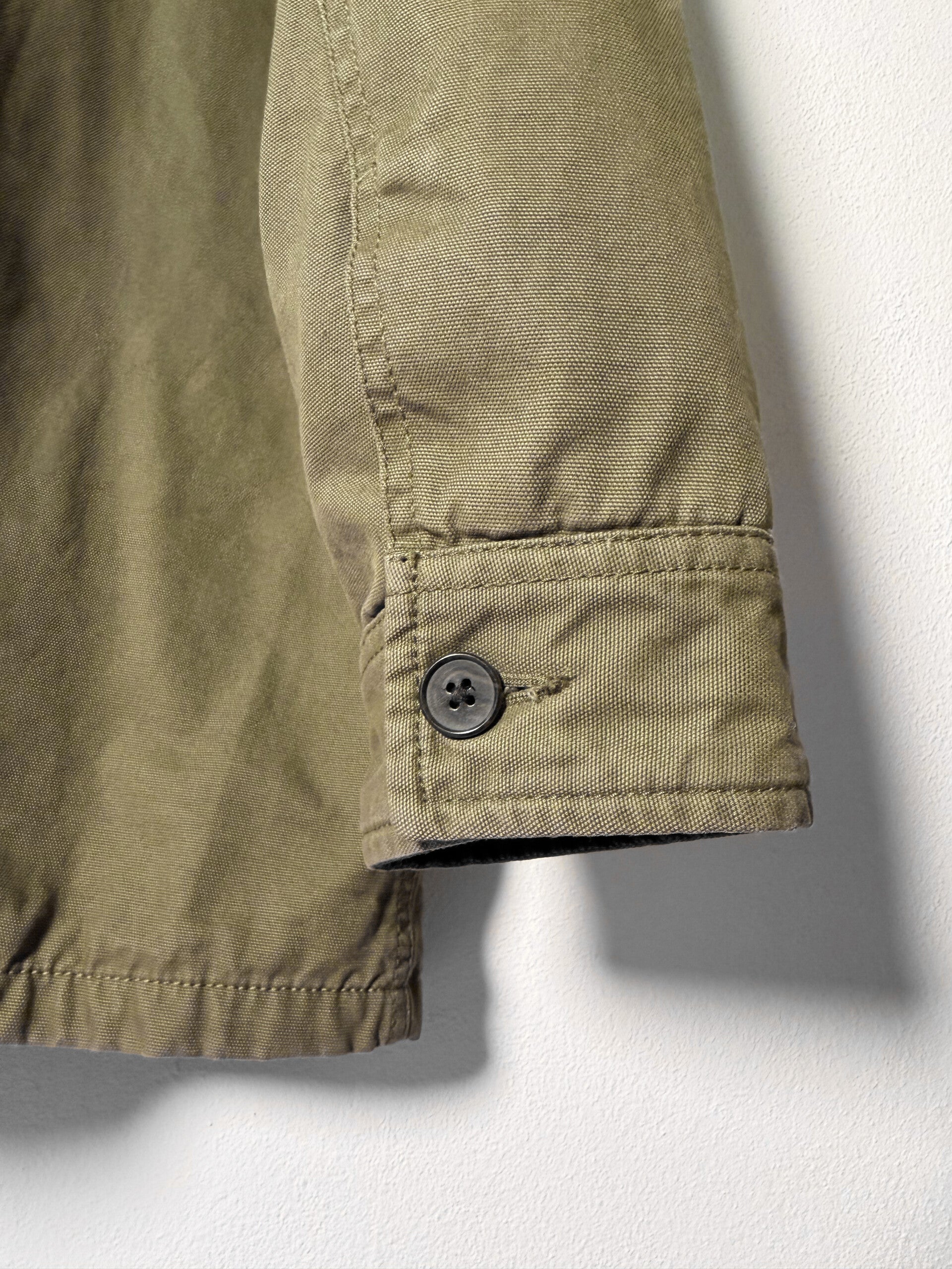Idealny przykład estetyki old money połączonej z wytrzymałością workwearu. Kurtka wykonana z grubego, wytrzymałego płótna bawełnianego w kolorze oliwkowym/sage green.
