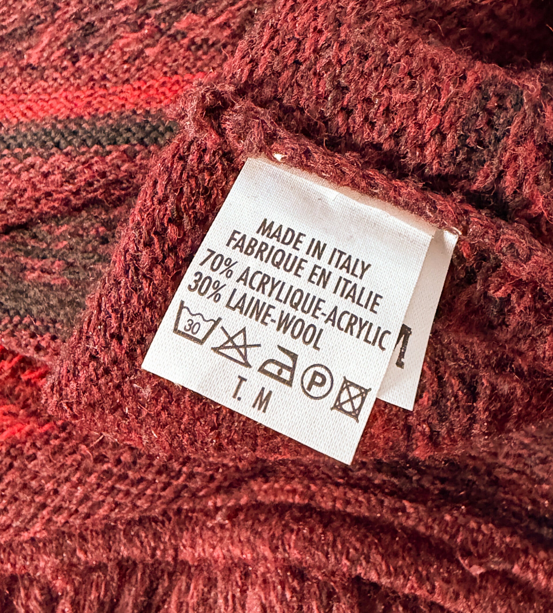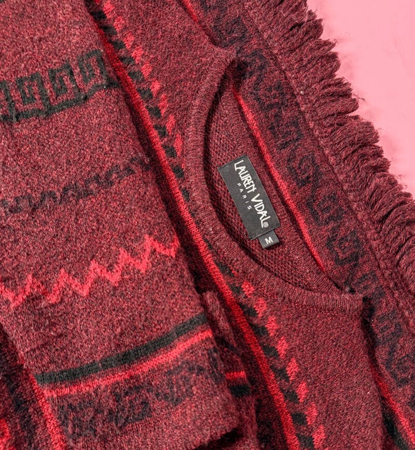 Kawałek historii mody od prestiżowej francuskiej projektantki Lauren Vidal. Ten sweter to idealne połączenie paryskiego szyku z etnicznym sznytem. Wykonany we Włoszech, zachwyca głębokim bordowym kolorem przełamanym ognistą czerwienią i czernią.